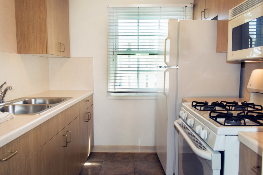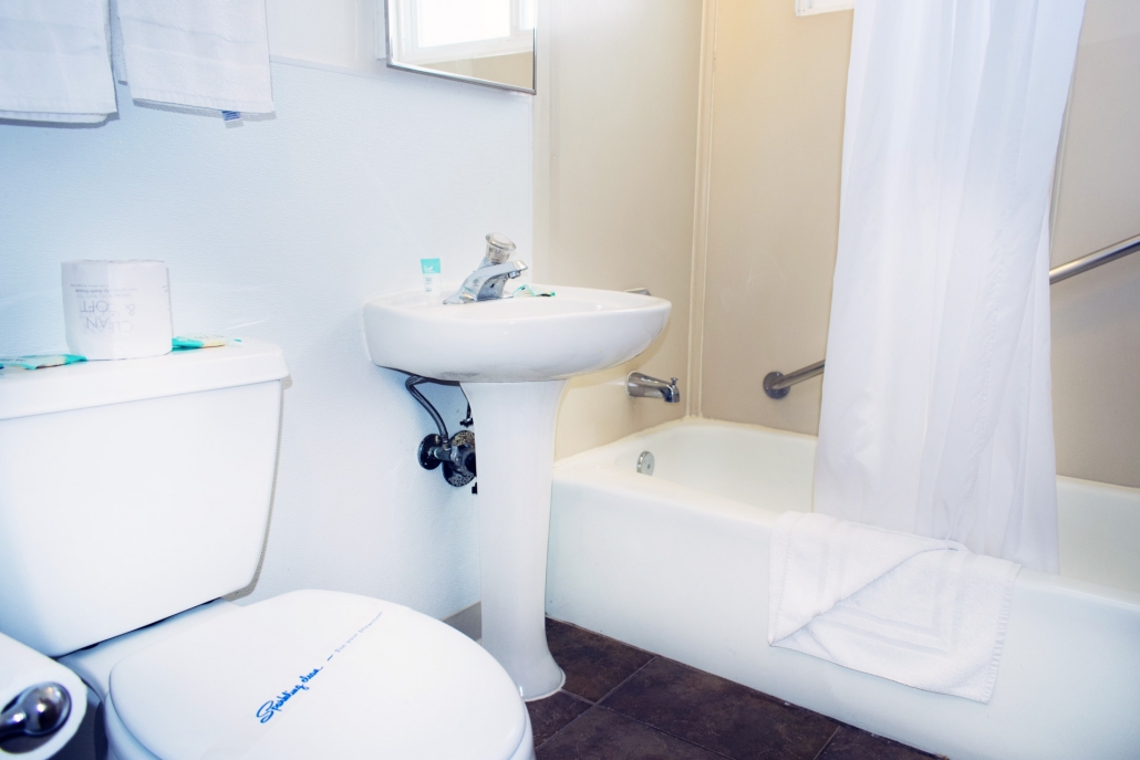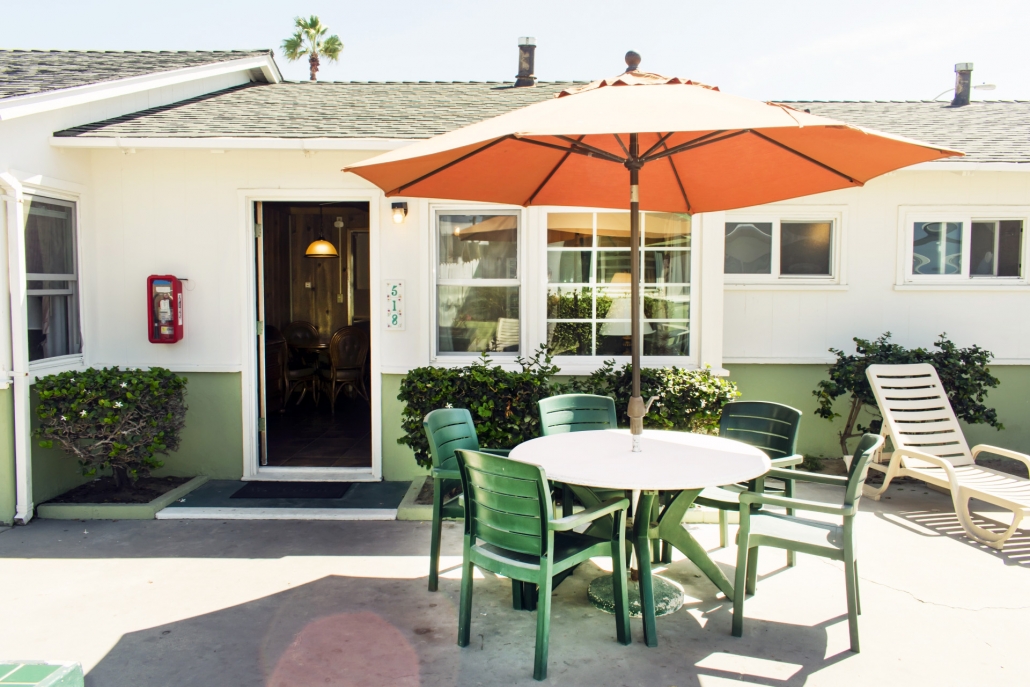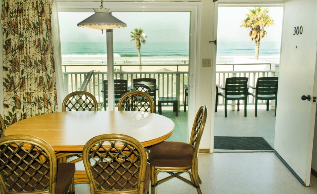 Our main building stands three-stories tall behind the cottages, and all rooms in the main building face out towards the ocean. A shared balcony on the 2nd and 3rd floor allows comfortable seating to enjoy the sight and the sounds of Southern California’s Pacific Beach. Although no view from the ground floor units, the front door conveniently leads right into the courtyard. All apartments include a separate bedroom, a living room, and a fully equipped kitchen. Every living room has a pull-out sleeper sofa.